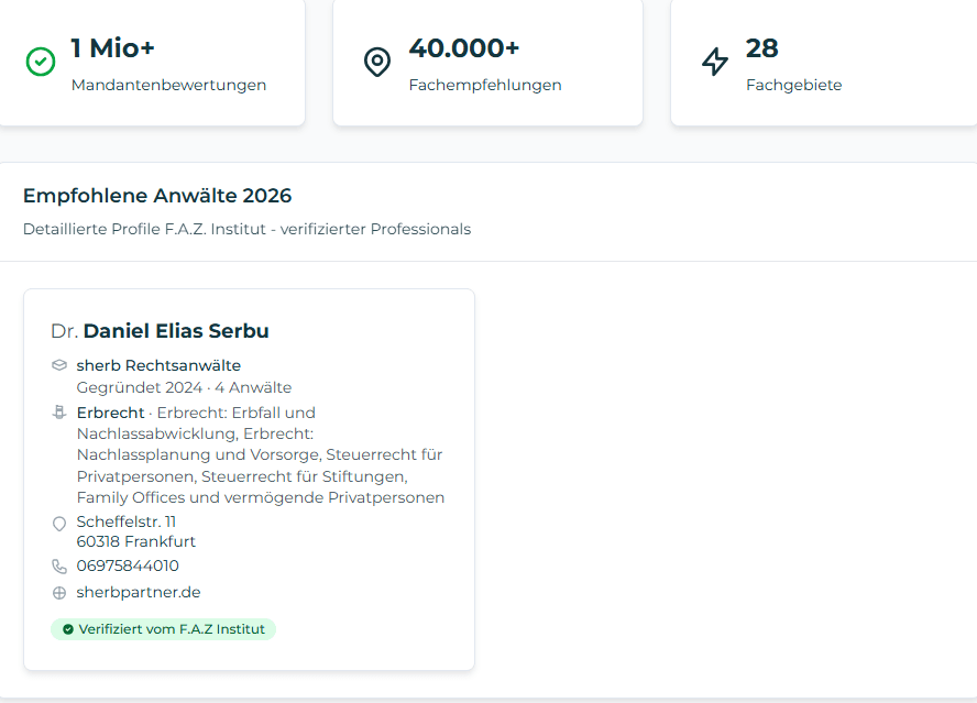 The F.A.Z. Institute and QuantiQuest have recognized Dr. Daniel Elias Serbu in their latest lawyer ranking as a TOP Lawyer 2026 in Inheritance Law. We are honored by this special recognition.